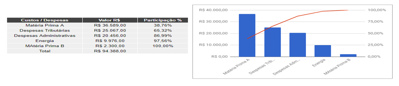 No caso abaixo, vemos que de nada adianta cortar cafézinho, papel, ou funcionários (despesas administrativas) quando os lugares de maior gasto, aqueles que vão influenciar no resultado são despesas tributárias e matéria prima.